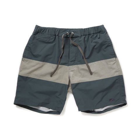 前後に10cm幅でシワ感のあるナイロン生地で切り替えを入れ、シンプルなショートパンツにアクセントをプラスしています。